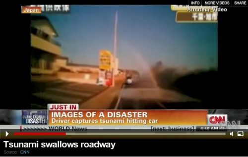 En la CNN.com acabo de encontrarme con un vídeo desde una perspectiva que no había visto hasta ahora…. Una persona filma desde su coche en marcha cómo le engulle el Tsunami y en cuestión de un par de segundos está flotando con su coche. La persona sobrevivió.